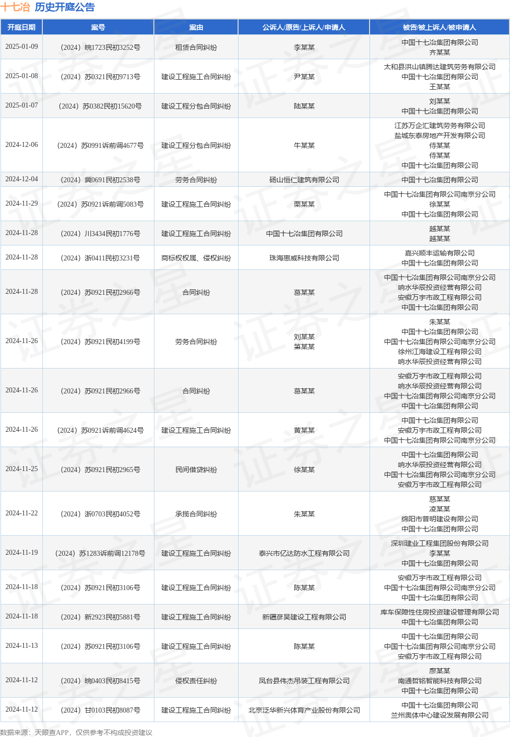 证券之星消息,根据天眼查APP显示,2024年近一年内以中国十七冶集团有限公司为当事人的历史开庭公告有146则,其中案由为“建设工程施工合同纠纷”的公告以50则居首,其次为“建设工程分包合同纠纷”有19则,“劳务合同纠纷”有11则。历史开庭公告(前20条)如下: