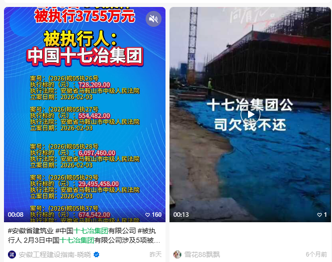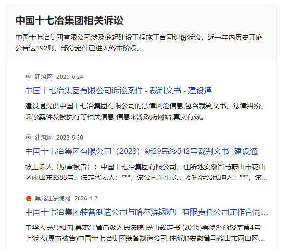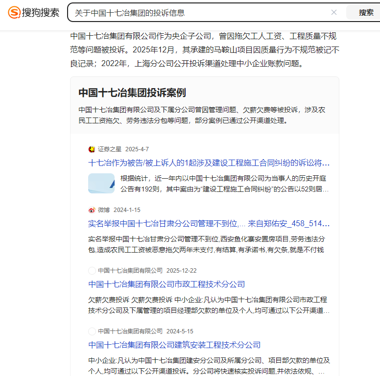 另外,网络上关于中国十七冶集团的投诉、诉讼等信息近几年持续有相关信息记录。