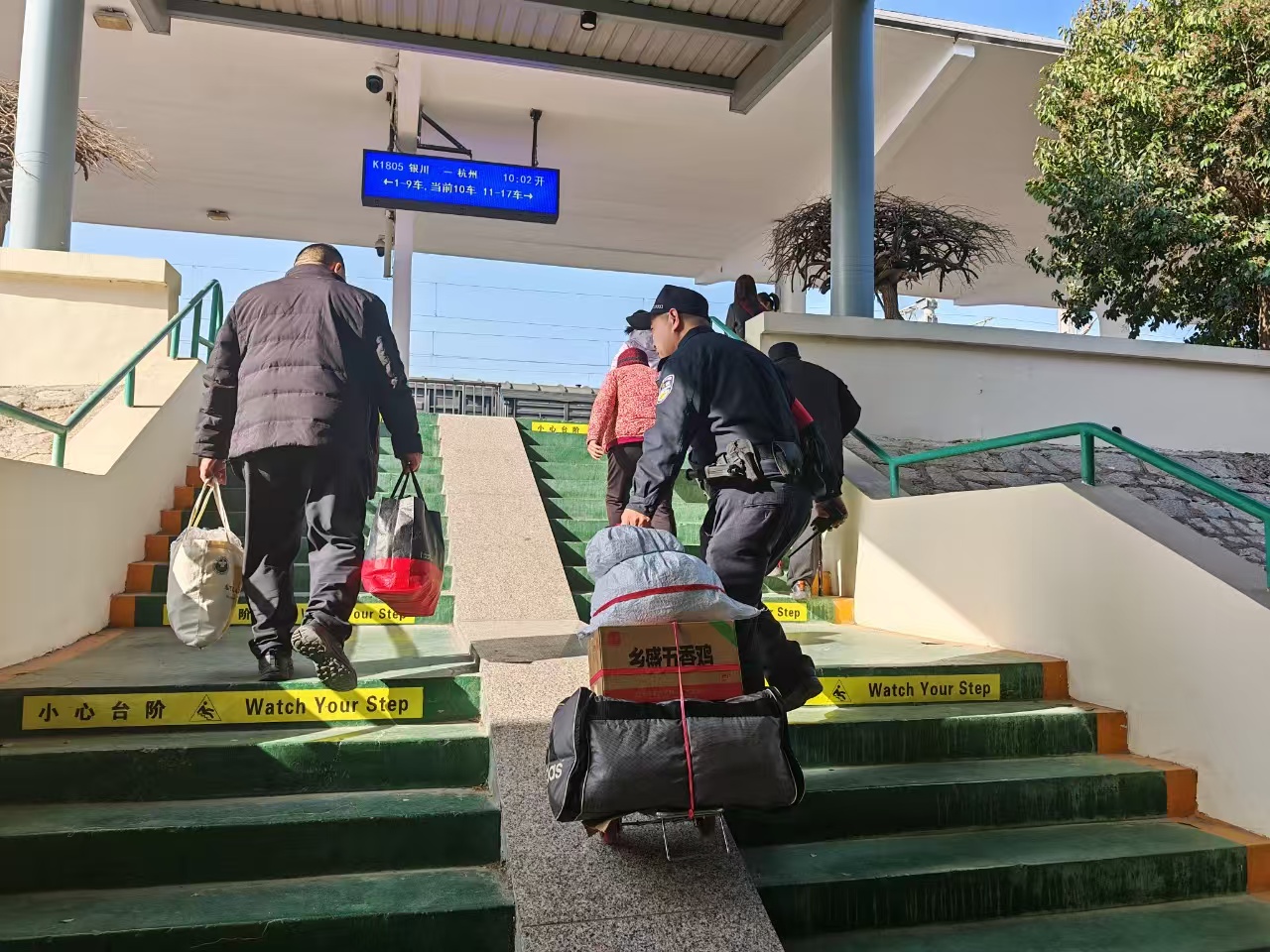 2月20日,禹城站迎来春运返程客流小高峰。济南铁路公安处禹城站派出所民警坚持确保旅客“平安出行、温馨出行、文明出行”的原则,帮助旅客,以暖心服务护航旅客出行。