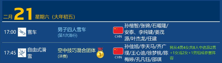2月21日,王心迪、徐梦桃这对“雪上伉俪”还将联手冲击自由式滑雪空中技巧混合团体金牌。