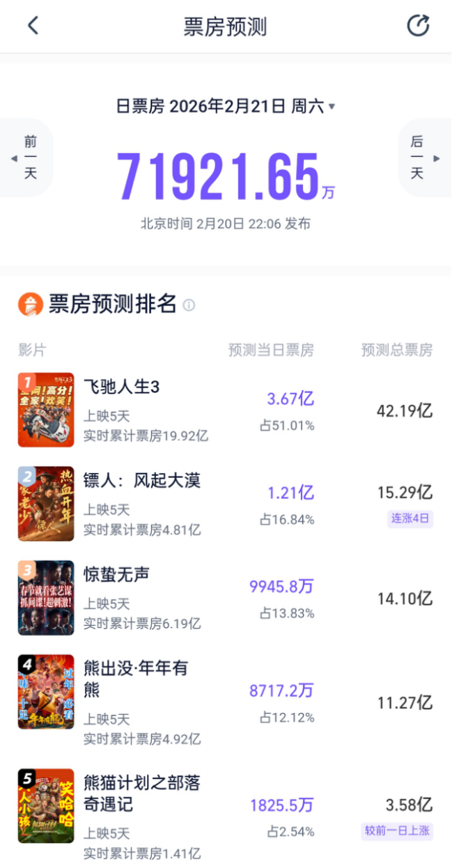 目前《镖人:风起大漠》累计票房达4.84亿元(截至2月21日5时38分),暂居档期第四位,距离第三位《熊出没:年年有熊》仅剩0.07亿元的差距。该片于2月19日(大年初三)、20日(大年初四)连续两日实现单日票房攀升,20日单日票房更是从上映初期的第四位攀升至档期第二,排片占比与上座率同步走高,市场热度持续攀升。