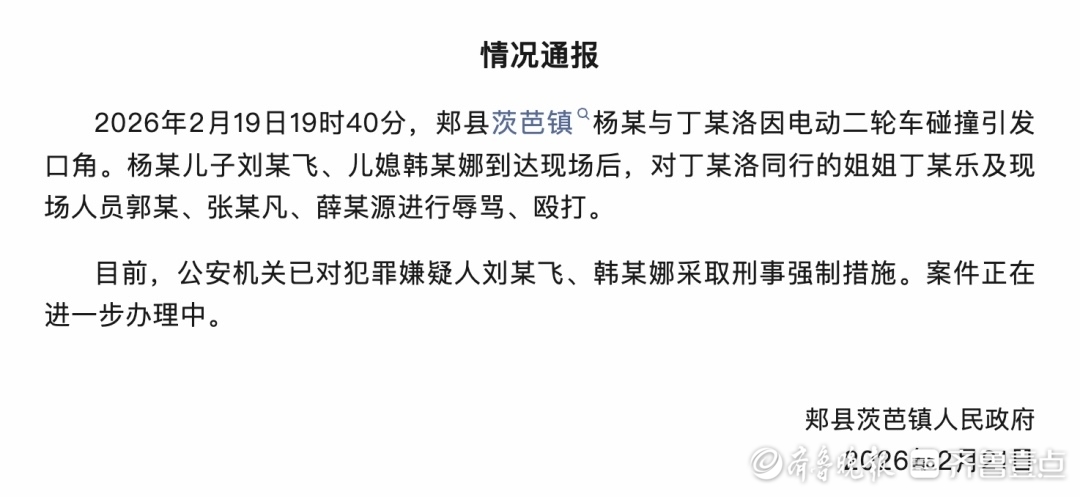 通报称,2月19日19时40分,郏县茨芭镇杨某与丁某洛因电动二轮车碰撞引发口角。杨某儿子刘某飞、儿媳韩某娜到达现场后,对丁某洛同行的姐姐丁某乐及现场人员郭某、张某凡、薛某源进行辱骂、殴打。