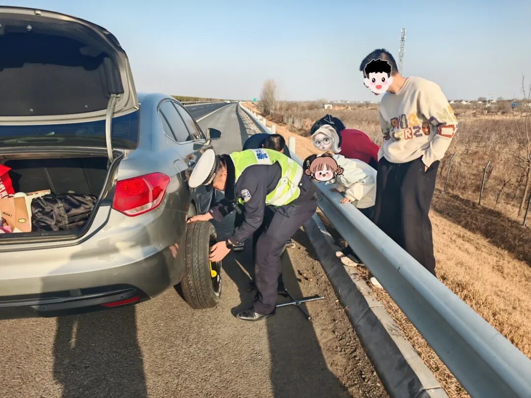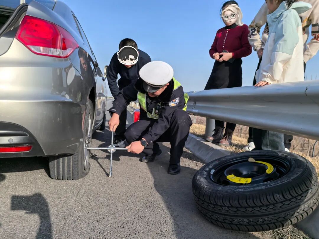 返程途中车辆爆胎 滨州交警化身“修理工”