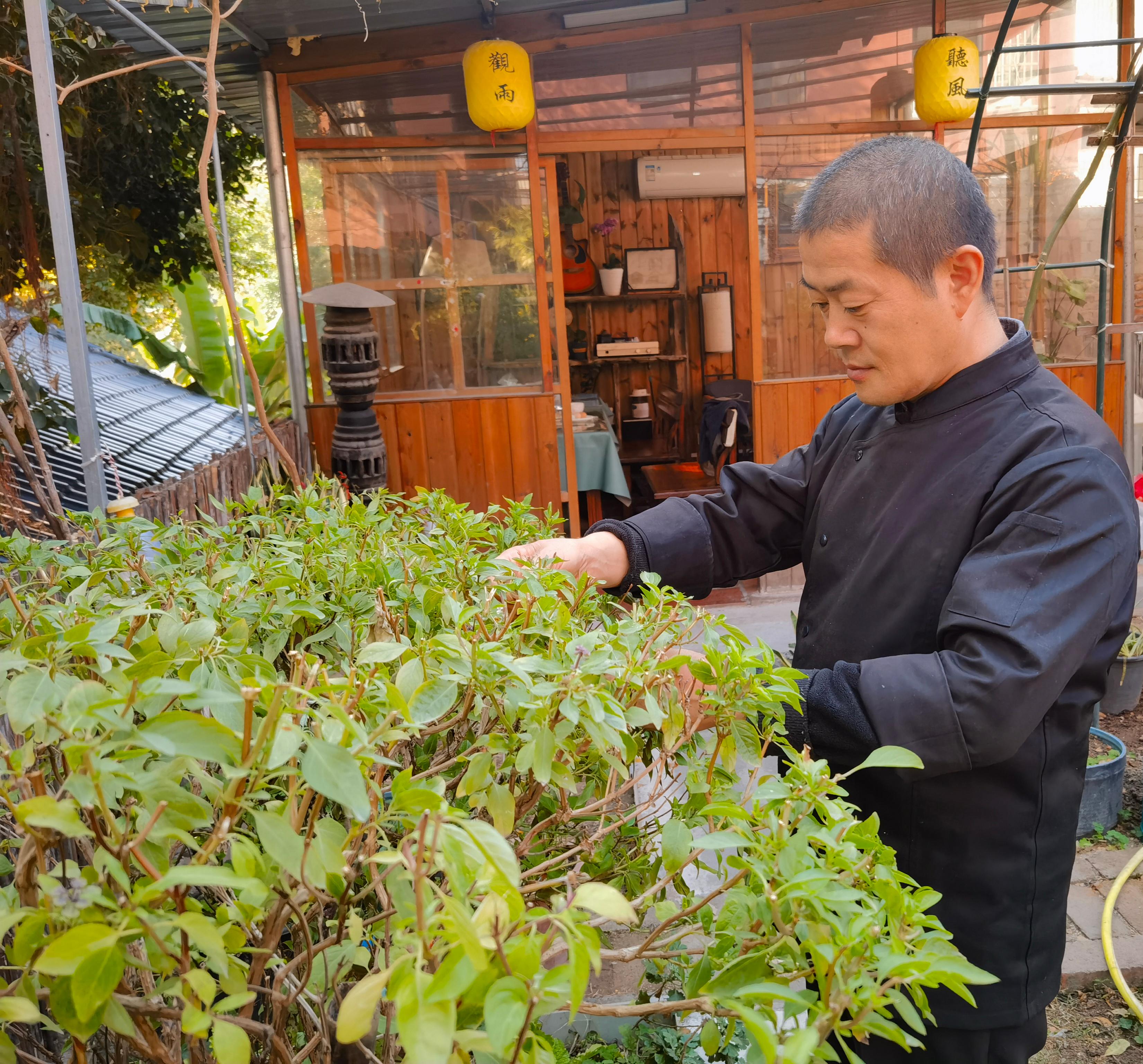 餐厅的“可食花园”,是喜子的“宝藏之地”,也是他的食材宝库。院子里种着罗勒、番茄、薄荷、生菜等做菜常用的食材,由他和妻子共同打理——妻子是种地的能手,心思细腻、耐心十足,每天都会细心照料这些植物,浇水、施肥、除草,不打农药、不施化肥,让它们纯天然生长,只为保留最本真的味道。